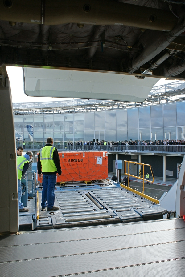 Airbus a même effectué une démonstration de chargement d'une palette dans l'A330F. Cependant, la palette n'a pas été chargée à bord, Airbus ayant enlevé les roulements pour le premier vol. Etaient positionnés au fond de la soute cargo, sur le pont principal, des conteneurs pleins d'eau pour simuler un chargement de fret au fond de l'avion.