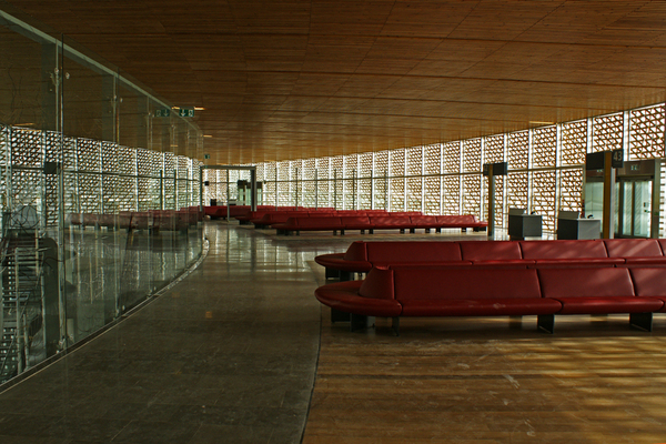 Les salles d’embarquement sont meublées avec des banquettes rouges disposées en arc de cercle, suivant la courbure du bâtiment. Les murs à l’intérieur ont été laissés en béton brut. Côté pistes, ce sont encore des surfaces vitrées qui ont été placées. Ici, plus de lattes en métal pour filtrer le soleil mais des lattes de bois entrecroisées ; à l’intersection de deux morceaux de bois, des pastilles de couleurs. C’est un choix des concepteurs qu’on peut questionner ici aussi. Outre l’aspect esthétique qui est discutable, c’est la vue qui est bouchée. On ne voit qu’à peine l’avion dans lequel on va entrer et l’extérieur. C’est pourtant ce que l’architecte dit avoir voulu faire : «dématérialiser les limites, entre terre et ciel»… Là encore, même si le but est de contrôler la lumière et la chaleur, c’est une occasion manquée de présenter une zone claire et ouverte sur l’extérieur.
