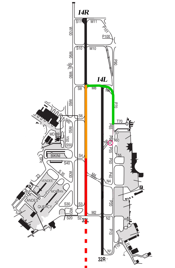 J’avais inconsciemment imaginé que les pistes parallèles étaient alignées symétriquement, côte-à-côte, et lorsqu’au bout de la 14L , j’ai traversé pour m‘aligner en 14R, j’ai fait comme si j’étais aligné en bout de piste. (Tracé vert sur le plan)