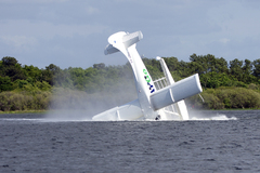 MISE A JOUR : Une personne qui semble-t-il filmait la scène lors du dernier passage de l'avion a capter le moment où l'avion plante le nez dans l'eau. On voit clairement que les trains sont sortis, en particulier les roulettes à l'avant. Si on tend l'oreille, on entend d'ailleurs certains spectateurs étonnés de cette anomalie au moment de toucher l'eau et craignant un incident.