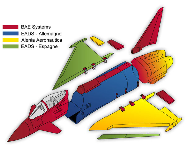 Eurofighter est un consortium composé d’EADS Cassidian en Espagne (13%) et en Allemagne (33%), BAE Systems (33%) au Royaume-Uni et finalement Alenia Aeronautica (21%) en Italie. La motorisation de l’appareil, l’Eurojet EJ200, est également le fruit d’un consortium de quatres entreprises européennes : Rolls-Royce (33%) du Royaume-Uni, MTU Aero Engines (33%) d’Allemagne, Avio (21%) d’Italie et ITP (13%) d’Espagne.
