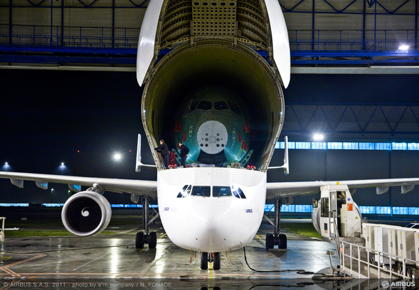 Le premier tronçon du futur long-courrier de l'avionneur européen ont été convoyés par Beluga au départ de St Nazaire. C'est la partie avant du fuselage qui a été amenée jusqu'aux installations d'Airbus à Toulouse.