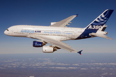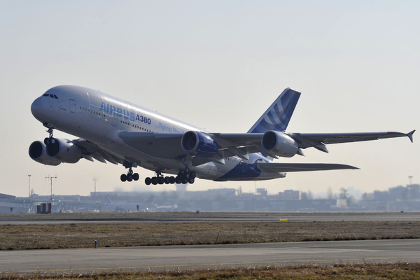 Le premier Airbus A380-800 construit, numéro de série MSN1 et immatriculé F-WWOW, a effectué un vol aujourd'hui avec sous son aile le futur moteur de l'A350 XWB.