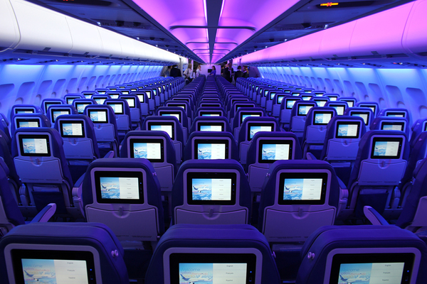 Air Transat ne blague pas avec le confort de ses passagers, offrant ainsi des nouveaux toilettes avec un plancher laminé d'aspect bois et un éclairage dans les tons bleus.