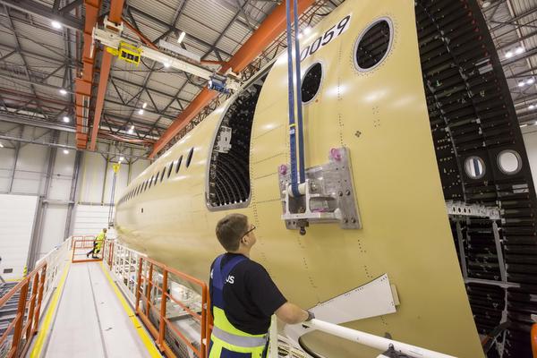 Le 25 septembre 2015, Airbus débute l'assemblage du fuselage de l'Airbus A350-1000 :