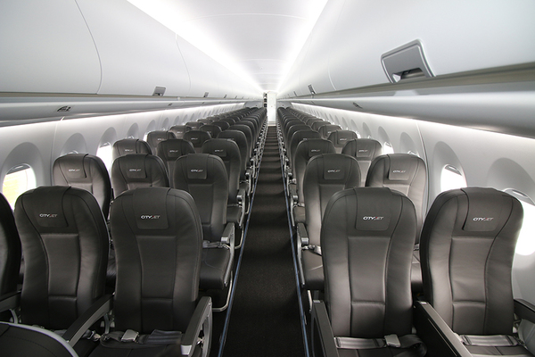 La cabine du SSJ100 de CityJet compte 98 sièges en cuir avec un espacement de 32" (81cm).