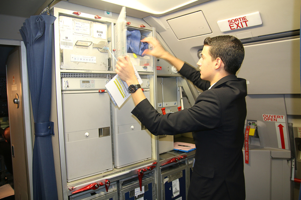 Pas de temps à perdre, les PNC se rendent à leurs postes. Je reste à l’avant de l’appareil en compagnie de Mike. Son premier travail est de vérifier les consignes de sécurité, toutes inscrites sur une check list. Après des tests de sécurité avec le cockpit et la vérification de tous les sièges de la cabine, il est déjà temps d’accueillir les passagers.