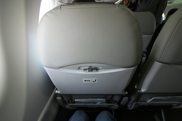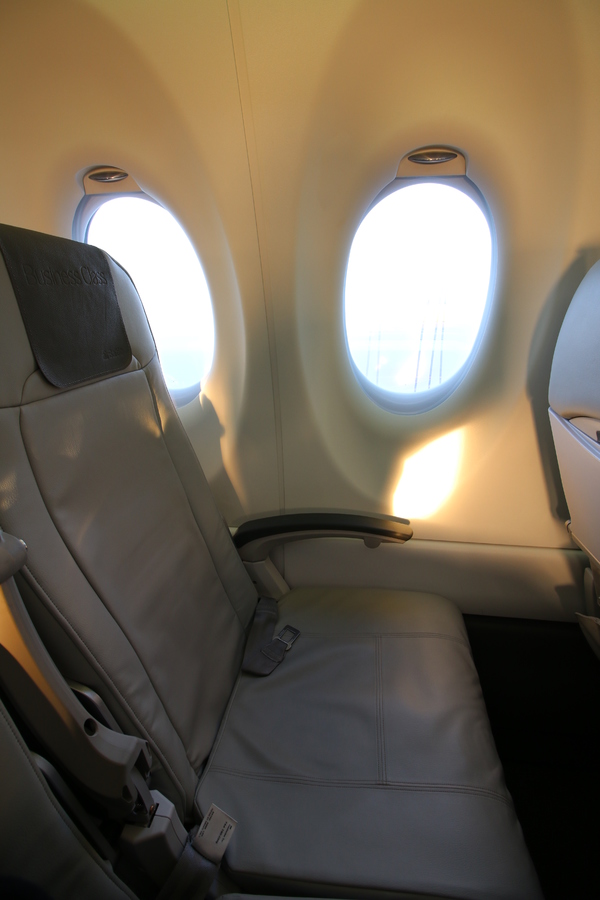 Pour le vol retour j’ai pris place en classe Business du Bombardier Cseries CS 300 immatriculé YL-CSE. Cette classe est composée de 20 sièges en configuration 2-3. Les sièges sont identiques à ceux de la classe économique avec pour différence l’appui tête qui montre bien que vous êtes en Business Class. Il n’existe aucune séparation entre la classe economy et business.