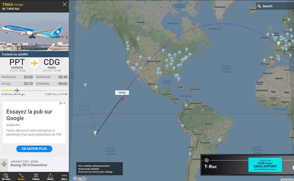 Suite à la restriction des Etats-Unis mise en place pour réduire la pandémie du coronavirus, Air Tahiti Nui a lancé un vol entre Papeete et Paris sans son escale à Los Angeles. Le vol TN64 a décollé ce dimanche 15 mars à 03h10 heure locale (14h10, heure de Paris) et devrait atterrir à Paris ce lundi 16 mars à 06h06 après plus de 16h00 de vol. Pour suivre le vol, cliquez sur l'image.