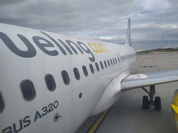 L'embarquement a débuté à 15h20 porte F31 et il s'est terminé très rapidement, car nous n'étions que 40 passagers à monter à bord de l'Airbus A320 de Vueling. L'appareil qui allait nous transporter jusqu'à Brest était donc un Airbus A320-200, immatriculé EC-MKM, msn 7017, âgé de 4 ans et demi et disposant d'une cabine unique pouvant accueillir un total de 186 passagers.