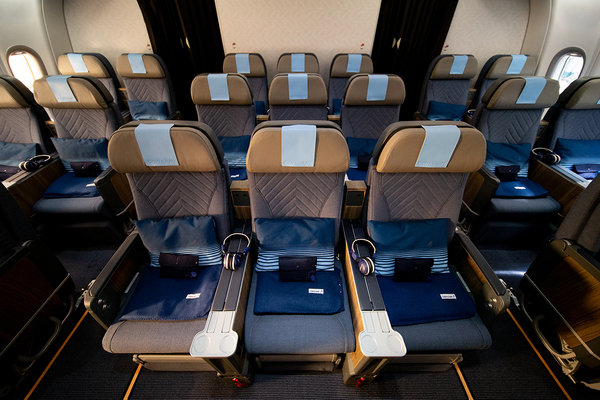 La cabine de cet A330neo est composée de 3 classes de voyage (business, premium éco, éco+) qui accueillent 352 passagers (20 sièges en Business, 21 sièges en Premium, et 311 sièges en Economie dont 33 sièges en Eco+).