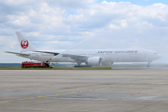 Le vol JL045 en provenance de Tokyo Haneda et qui a atterrit à Roissy à 15h46 (heure de Paris), a été accueilli par le traditionnel “Water Salute” par les Pompiers de l'aéroport.