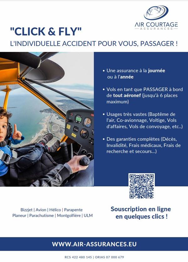 Air Courtage lance une nouvelle assurance appelée "individuelle accident click & fly". Cette assurance est destinée uniquement aux passagers d'un aéronef (parapente, avion, hélico, ULM, planeur, montgolfière jet privé) jusqu'à 6 places maximum . Cette assurance peut être souscrite à la journée ou à l'année directement sur le site internet d'Air Courtage.