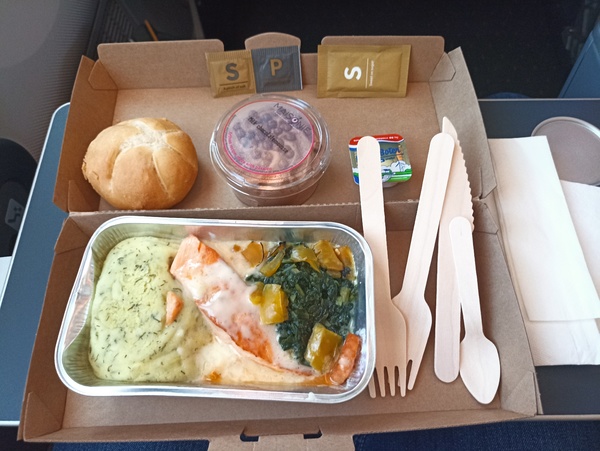 Une heure après le décollage, il était l'heure de dîner. En classe Premium Economy, un repas est offert aux voyageurs avec un plat chaud, un dessert et une boisson. Pour notre part, nous avons choisi du saumon avec de la purée de pomme de terre, des épinards et en dessert, une mousse au chocolat. Le tout est servi dans un plateau en carton avec des couverts en bois.