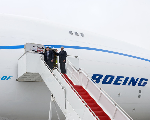Les pilotes Mark Feuerstein et Tom Imrich entrant dans le Boeing 747-8F pour le premier vol