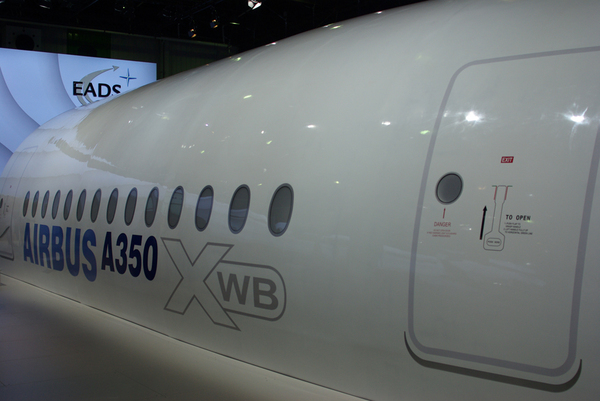 Vue d'une maquette de l'Airbus A350 XWB sur le stand EADS au Salon du Bourget 2009